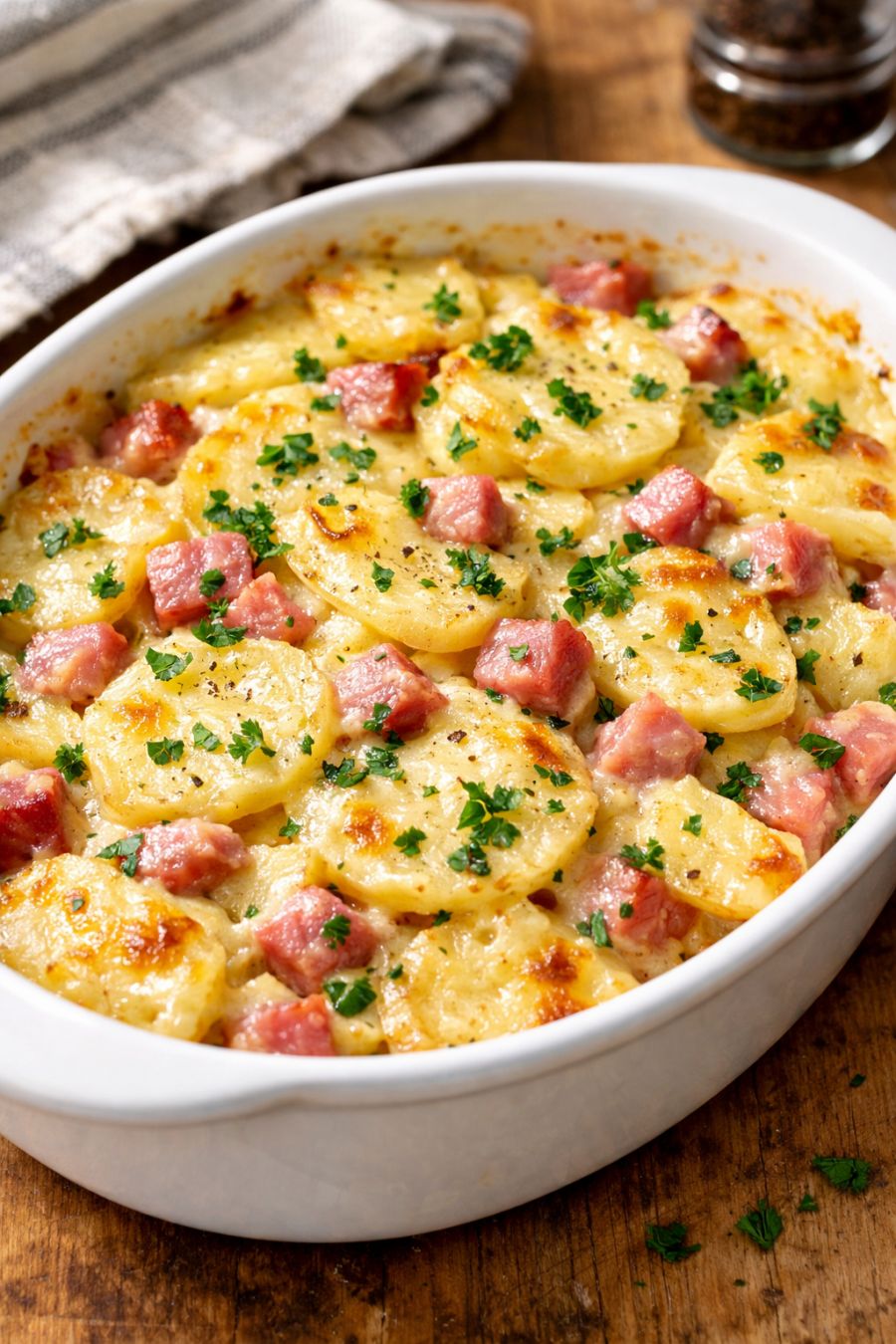 For extra richness, you can substitute half-and-half for part or all of the milk; just know the dish will be more indulgent and slightly thicker. If you like a bit of onion flavor, add 1/2 cup very thinly sliced onion or 1/4 cup finely chopped onion between the potato layers before pouring on the soup mixture; this keeps the ingredient list simple while adding a savory note. To lean into a more traditional Amish-style profile, skip any added cheese and let the potatoes, ham, and soup be the stars—but if your crowd loves cheese, sprinkle 1 to 1 1/2 cups shredded mild cheddar between the layers or over the top during the last 30 minutes of cooking. You can also swap the cream of mushroom soup for cream of celery or cream of chicken for a slightly different flavor while keeping the same easy method. For a lighter version, use reduced-sodium ham, low-sodium condensed soup, and 2% milk, then taste at the end and season carefully. Leftovers keep well in the refrigerator for up to 3 days; reheat gently in the microwave or in a covered baking dish at 350°F with a splash of milk to loosen the sauce.